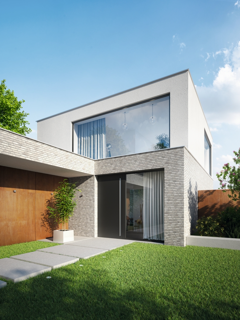 - Sivá fasáda + hliníkové okná v rovnakom tóne → elegantný minimalistický vzhľad